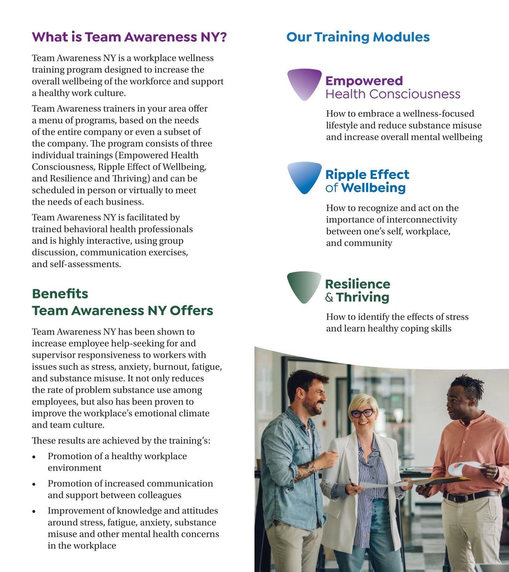 Team Awareness NY is a specialized workplace wellness training program designed to support a healthy work culture and increase the overall wellbeing of those in your workforce.